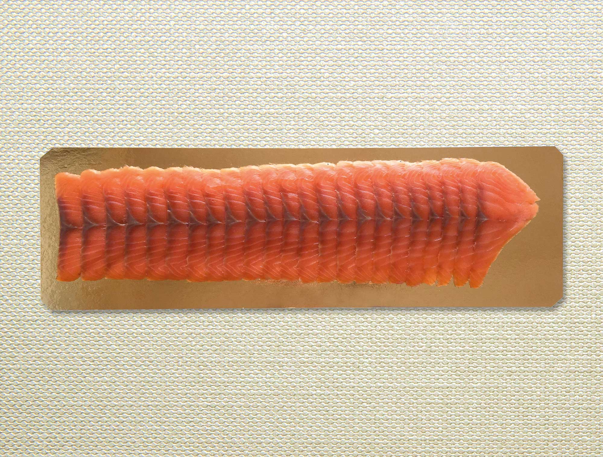 Räucherlachs „Superior“, ganze Seite, in Scheiben vorgeschnitten (ohne Dekorationsmaterial).
